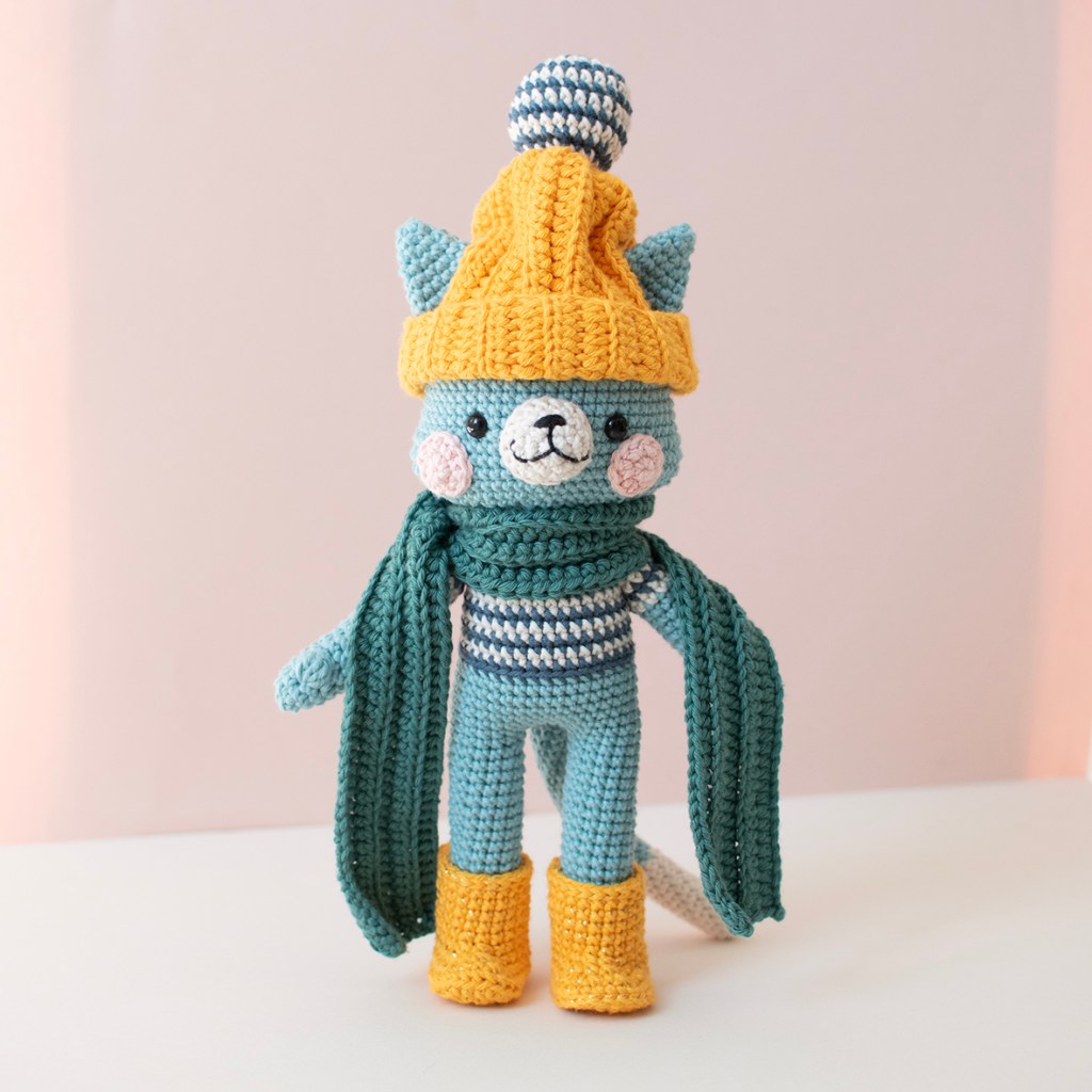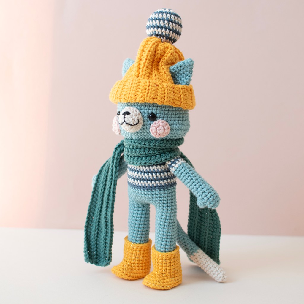 Before starting: Lenny Cat is an intermediate project, worked in a continuous spiral. To keep track of the rounds you may use a stitch marker or safety pin to mark the beginning of a round. The head, body and legs are worked in a single piece. Lenny Cat also has 3 accessories: a hat, a scarf and a pair of boots. Remember that it’s always advisable to give the entire pattern a read before starting crocheting and, most importantly, be patient with yourself!