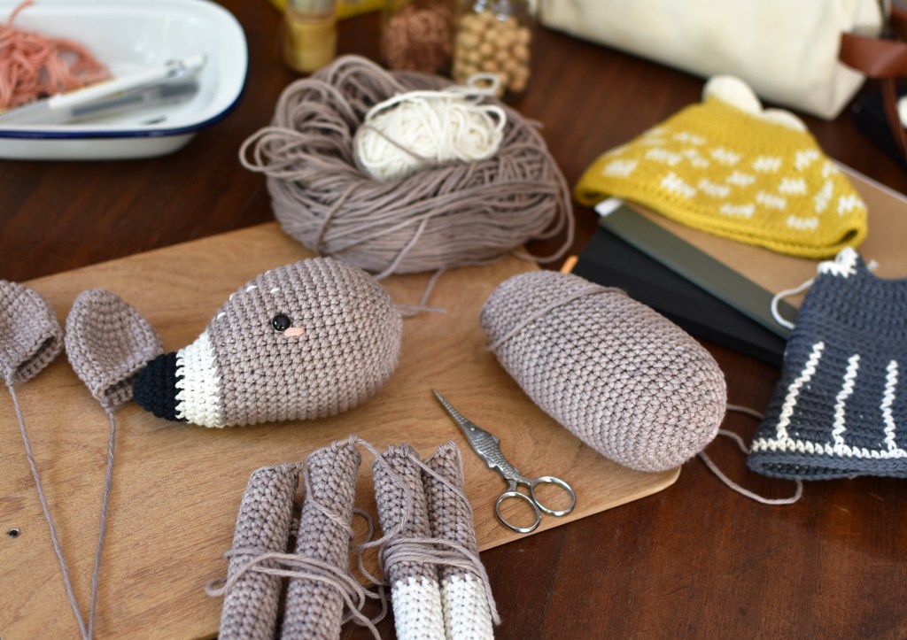 CABEZA (comiencen con "black", por el hocico) 1v. Tejan un anillo de 6 mp [6] 2v. 1 aum en cada uno de los 6 mp [12] 3v. (1 mp, 1 aum) repetan 6 veces [18] 4v-5v. 1 mp en cada uno de los 18 mp [18] Cambien a "coconut milk" 6v. 1 mp en cada uno de los 18 mp [18] 7v. (2 mp, 1 aum) repitan 6 veces [24] 8v. 1 mp en cada uno de los 24 mp [24] 9v. 6 mp, (1 aum, 1 mp) repitan 6 veces, 6 mp [30] Cambien "portobello". 10v. 1 mp en cada uno de los 30 mp [30] 11v. 7 mp, (1 aum, 2 mp) repitan 6 veces, 5 mp [36] 12v-13v. 1 mp en cada uno de los 36 mp [36] 14v. 8 mp, (1 aum, 3 mp) repitan 6 veces, 4 mp [42] 15v-16v. 1 mp en cada uno de los 42 mp [42] 17v. (6 mp, 1 aum) repitan 6 veces [48] 18v-24v. 1 mp en cada uno de los 48 mp [48] Inserten los ojos de seguridad entre las vueltas 17 y 18, a 24 puntos de distancia entre sí. Con "coconut milk", borden pequeñas líneas en la cabeza. Con "dusty pink", borden las mejillas debajo de los ojos. 25v. (6 mp, 1 dism) repitan 6 veces [42] 26v. 1 mp en cada uno de los 42 mp [42] 27v. (5 mp, 1 dism) repitan 6 veces [36] 28v. (4 mp, 1 dism) repitan 6 veces [30] 29v. (3 mp, 1 dism) repitan 6 veces [24] Rellenen bien la cabeza. 30v. (2 mp, 1 dism) repitan 6 veces [18] 31v. (1 mp, 1 dism) repitan 6 veces [12] 32v. 6 dism [6] Corten dejando una hebra larga para cerrar los últimos 6 puntos. Con la aguja de tapicería, pasen por el medio de cada punto y ajusten para cerrar. Rematen.