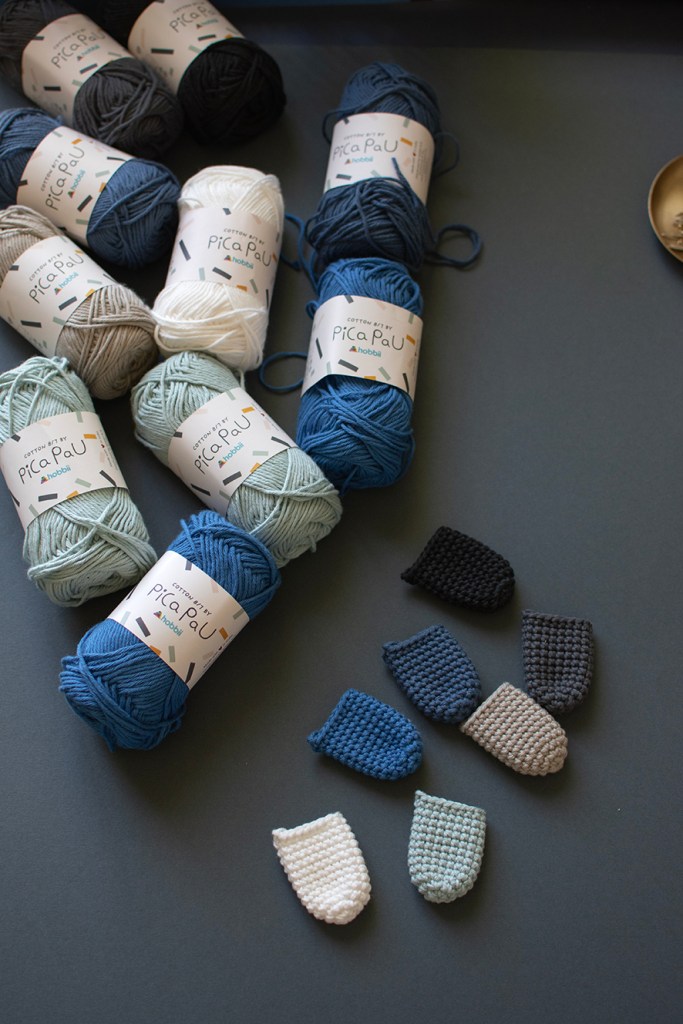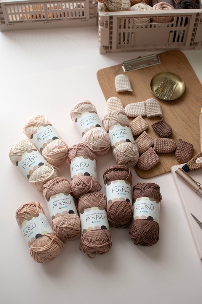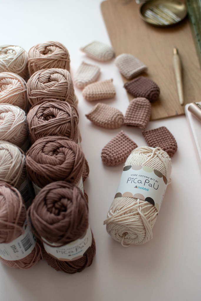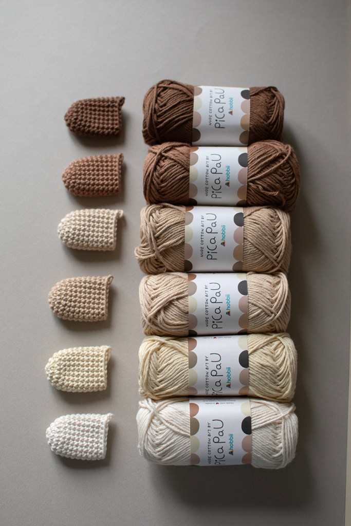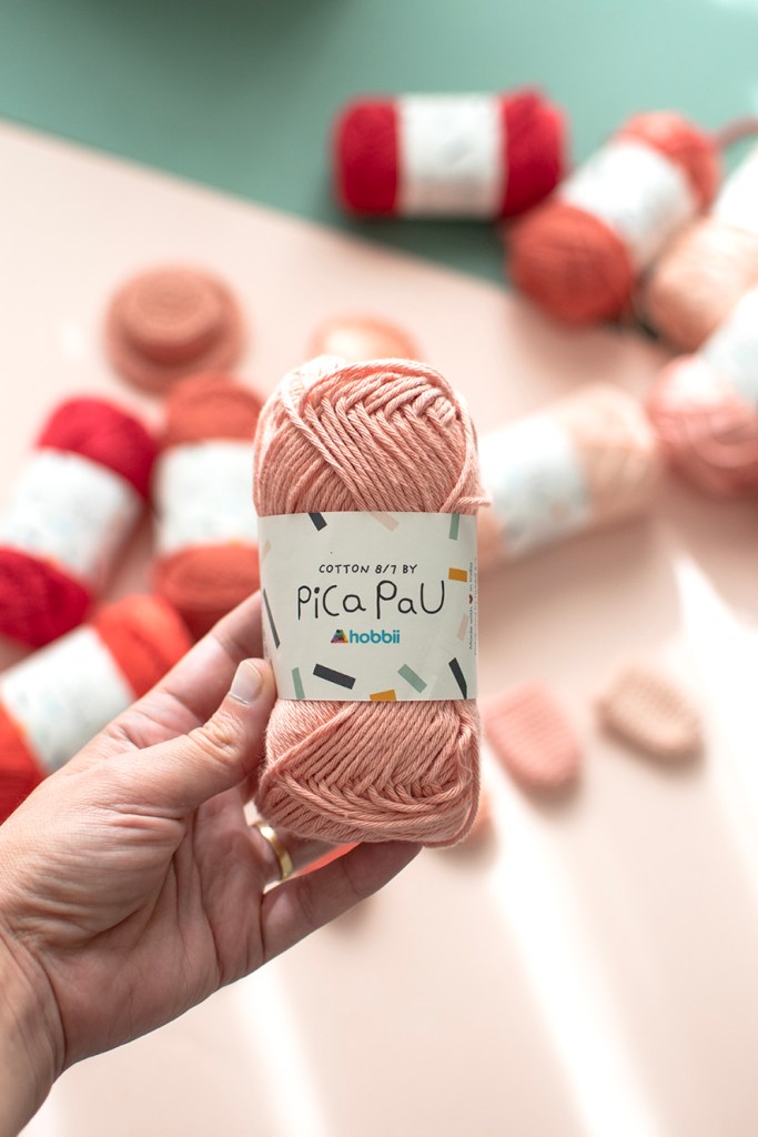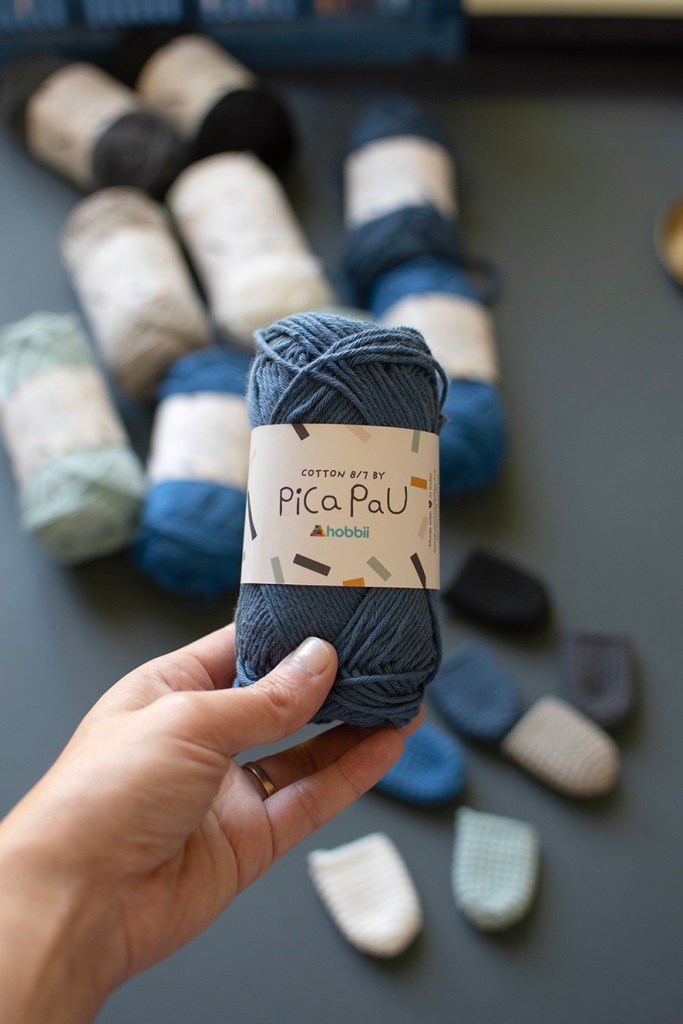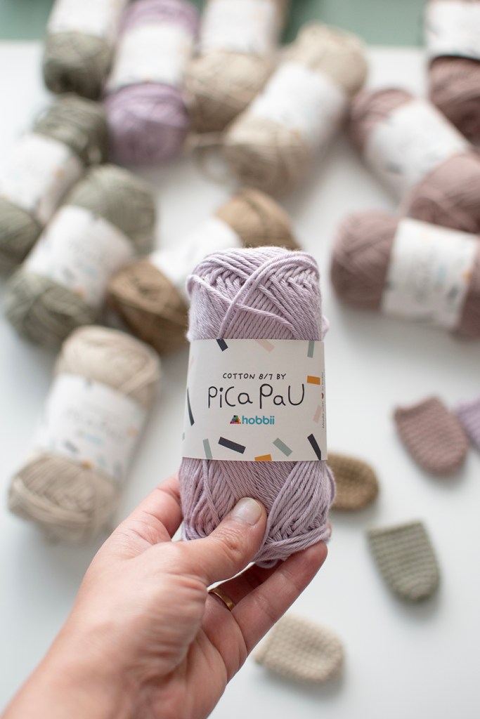 Pica Pau Cotton 8/7 is a 100% combed cotton yarn created in collaboration with Hobbii Yarns. Cotton 8/7 holds its shape beautifully without being stiff, making it ideal for amigurumi and other sculptural work that calls for clean stitches and expressive detail. If you are planning on using the yarn for amigurumi, I recommend using a 2.75 or a 3 mm crochet hook. For other projects, you can follow the sizes on the label of a 5 mm crochet hook or 4 mm knitting needles.