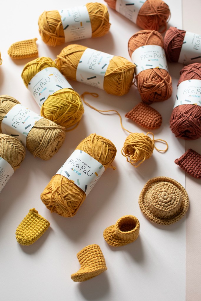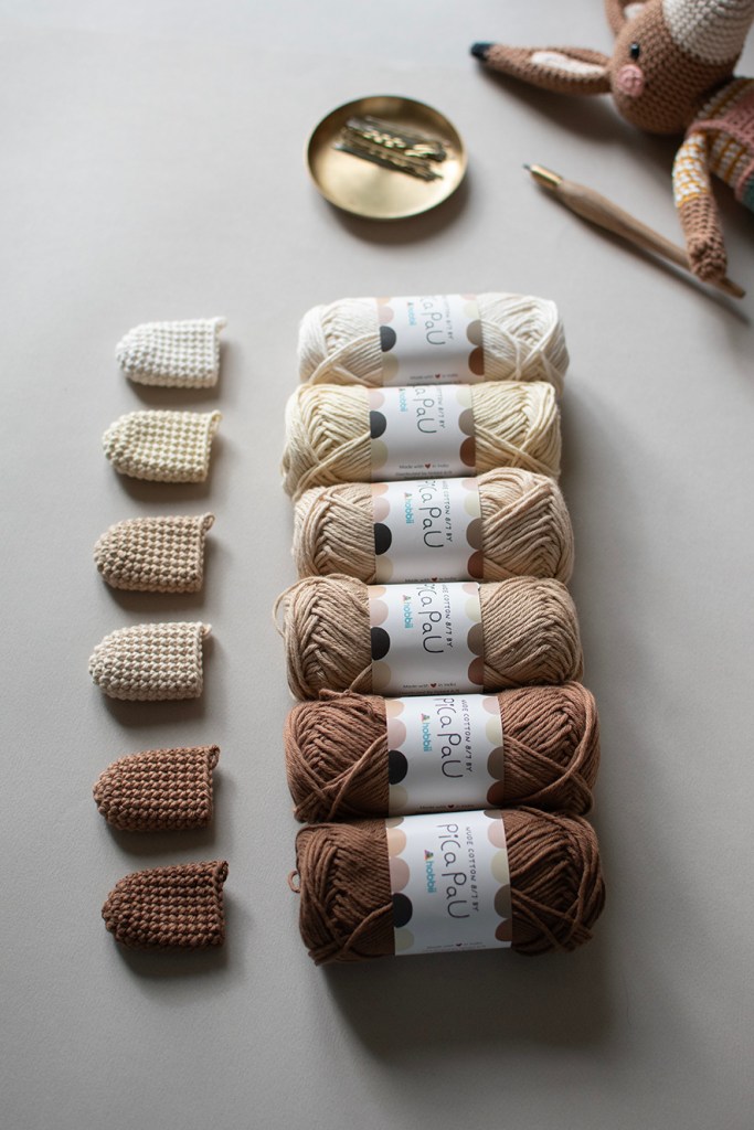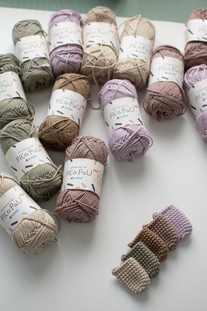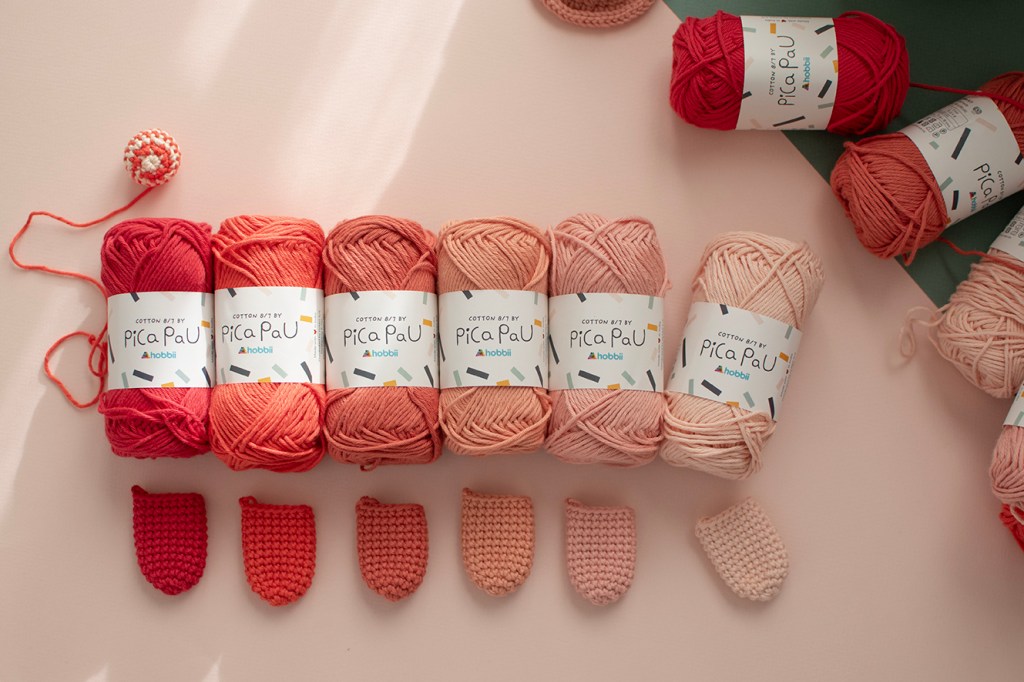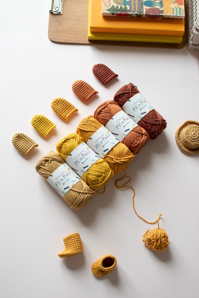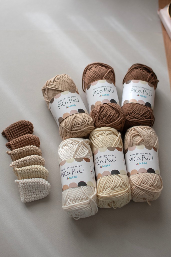 Pica Pau Cotton 8/7 is a 100% combed cotton yarn created in collaboration with Hobbii Yarns. Cotton 8/7 holds its shape beautifully without being stiff, making it ideal for amigurumi and other sculptural work that calls for clean stitches and expressive detail. If you are planning on using the yarn for amigurumi, I recommend using a 2.75 or a 3 mm crochet hook. For other projects, you can follow the sizes on the label of a 5 mm crochet hook or 4 mm knitting needles.