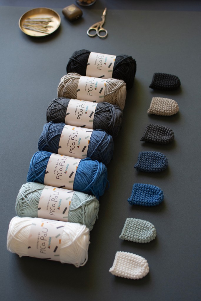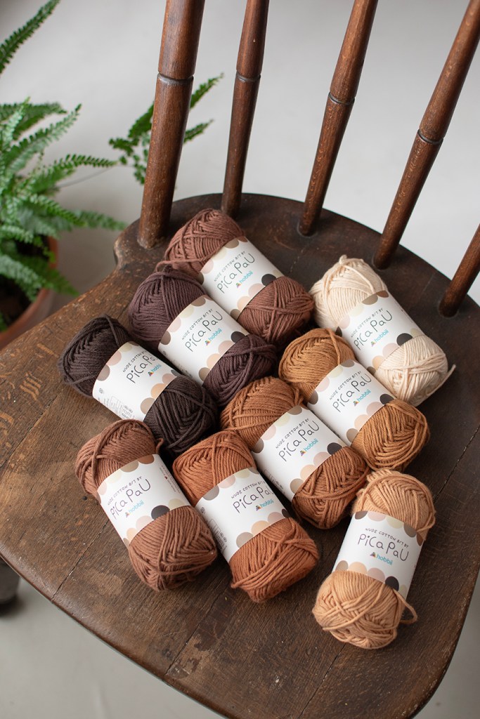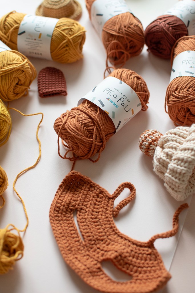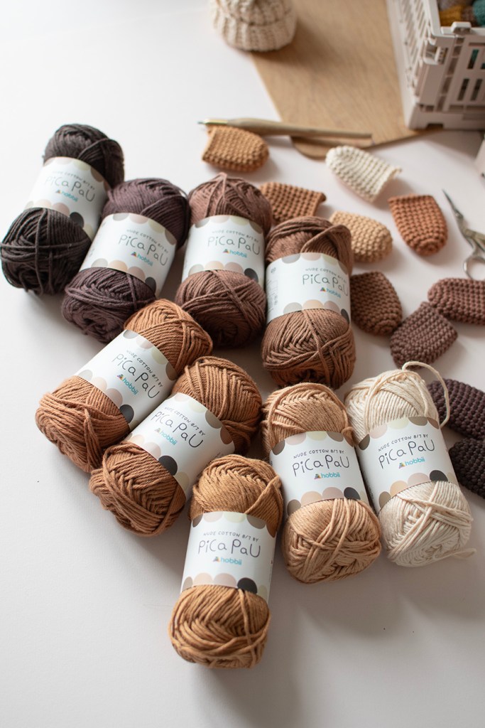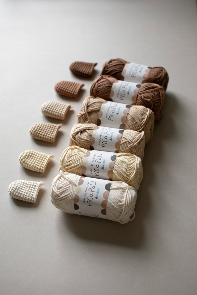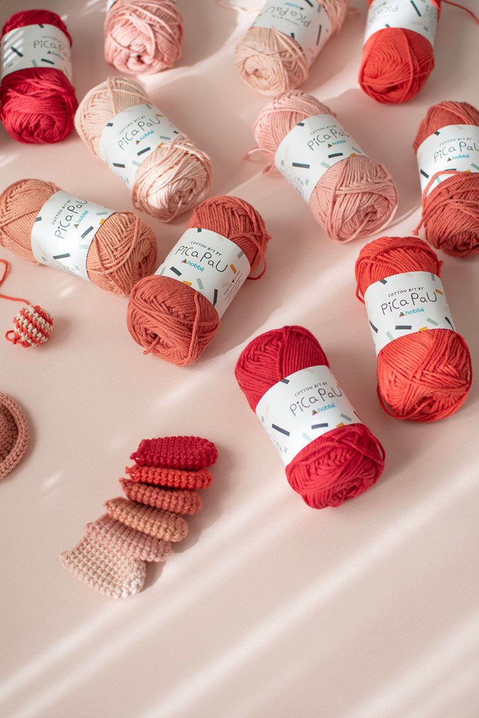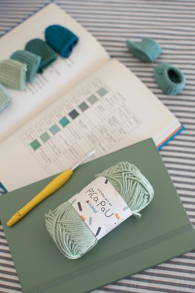 Pica Pau Cotton 8/7 is a 100% combed cotton yarn created in collaboration with Hobbii Yarns. Cotton 8/7 holds its shape beautifully without being stiff, making it ideal for amigurumi and other sculptural work that calls for clean stitches and expressive detail. If you are planning on using the yarn for amigurumi, I recommend using a 2.75 or a 3 mm crochet hook. For other projects, you can follow the sizes on the label of a 5 mm crochet hook or 4 mm knitting needles.