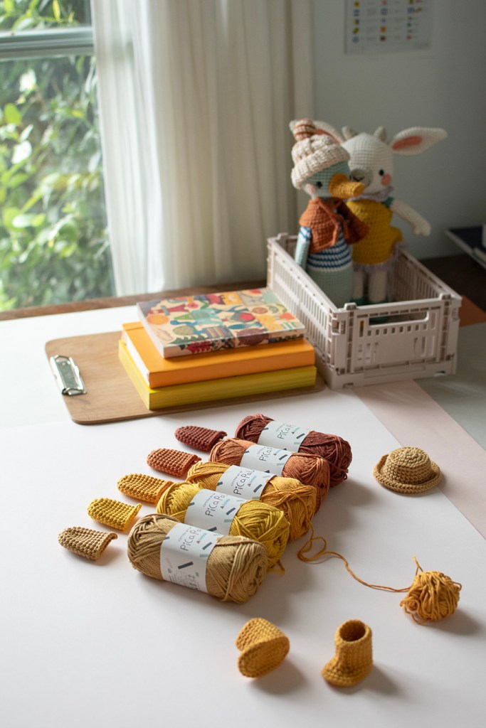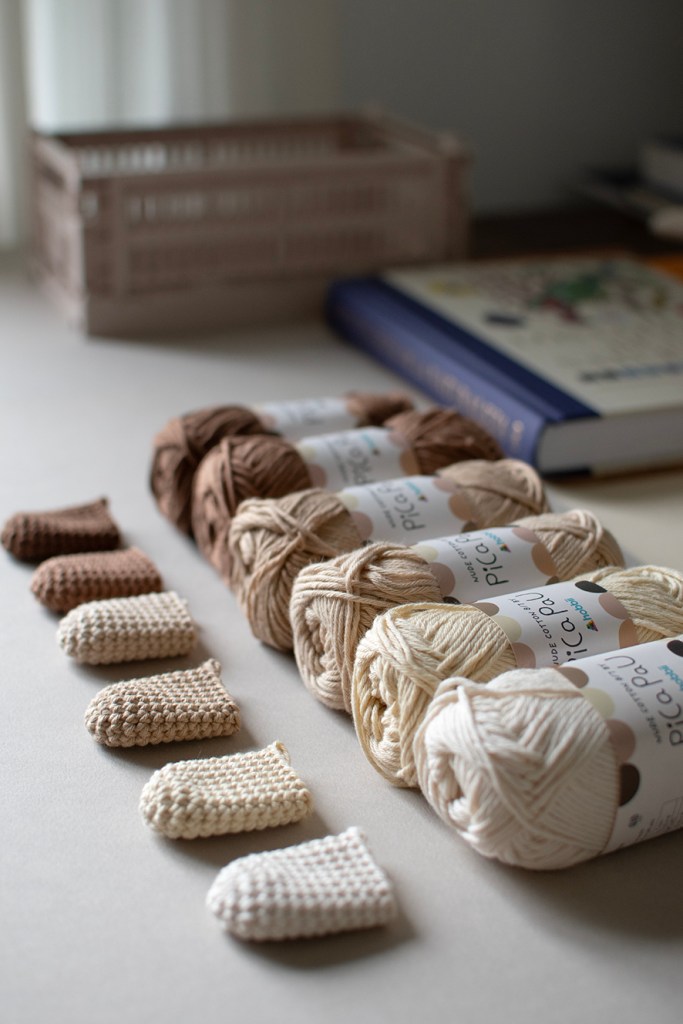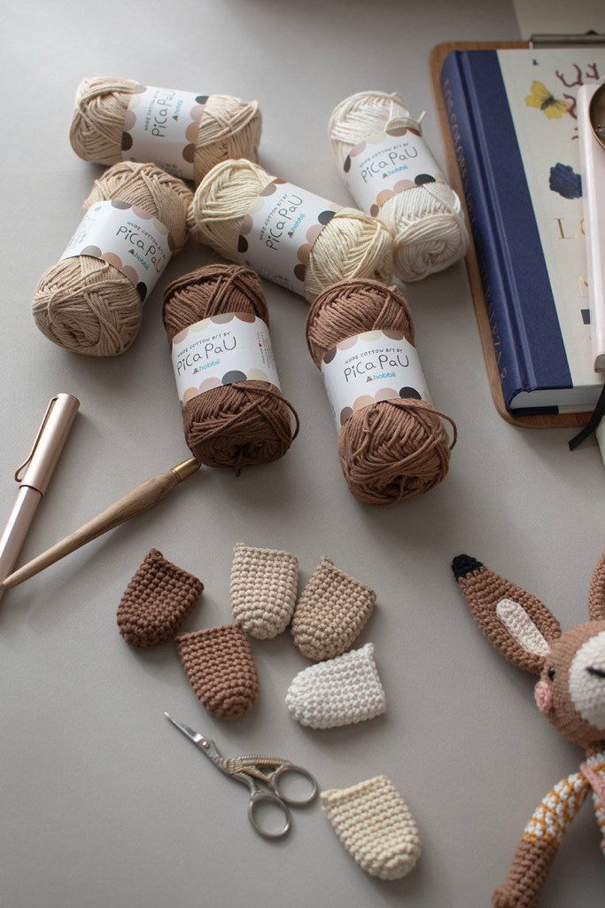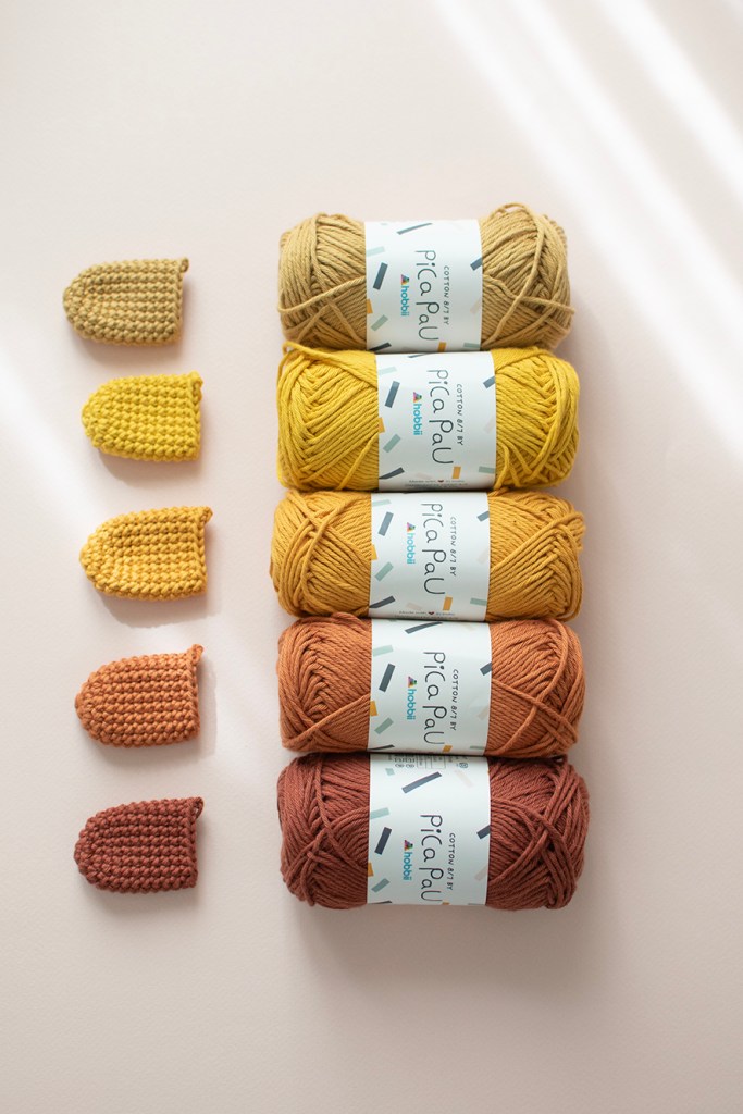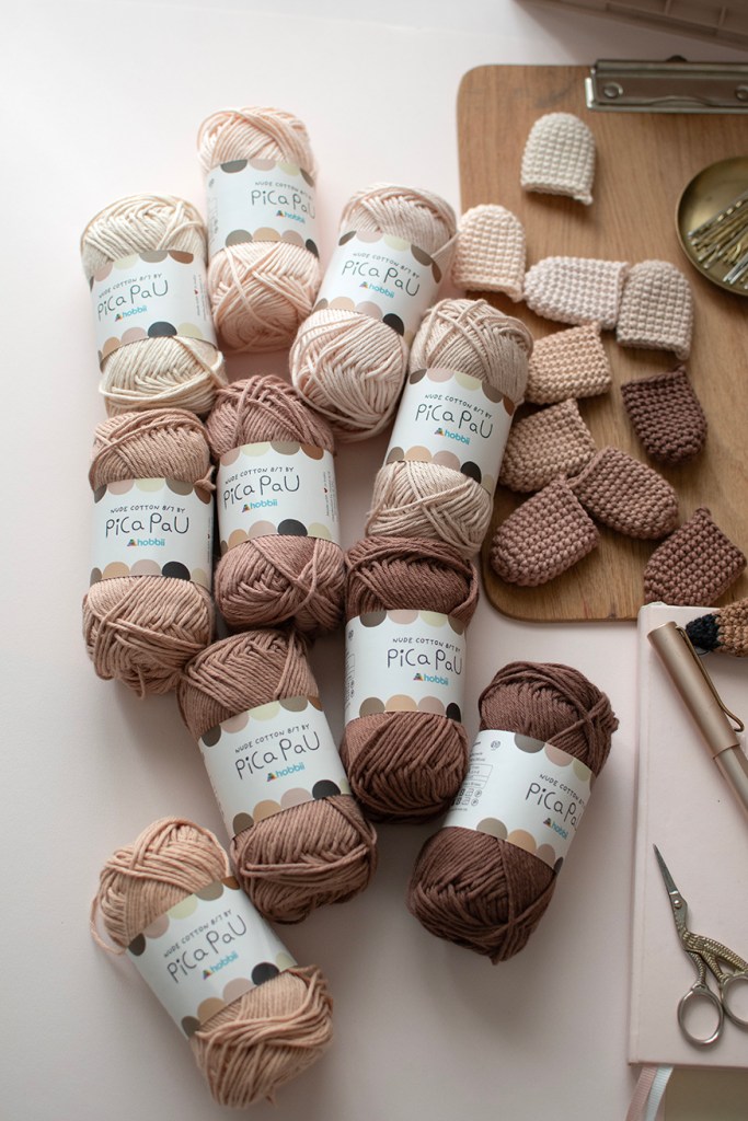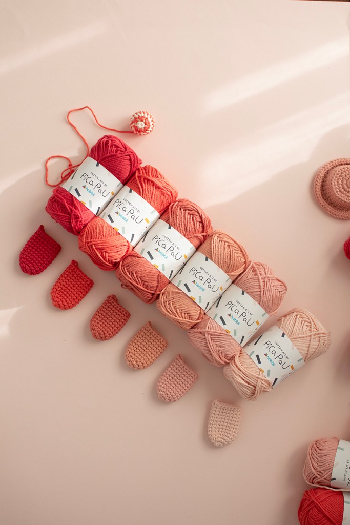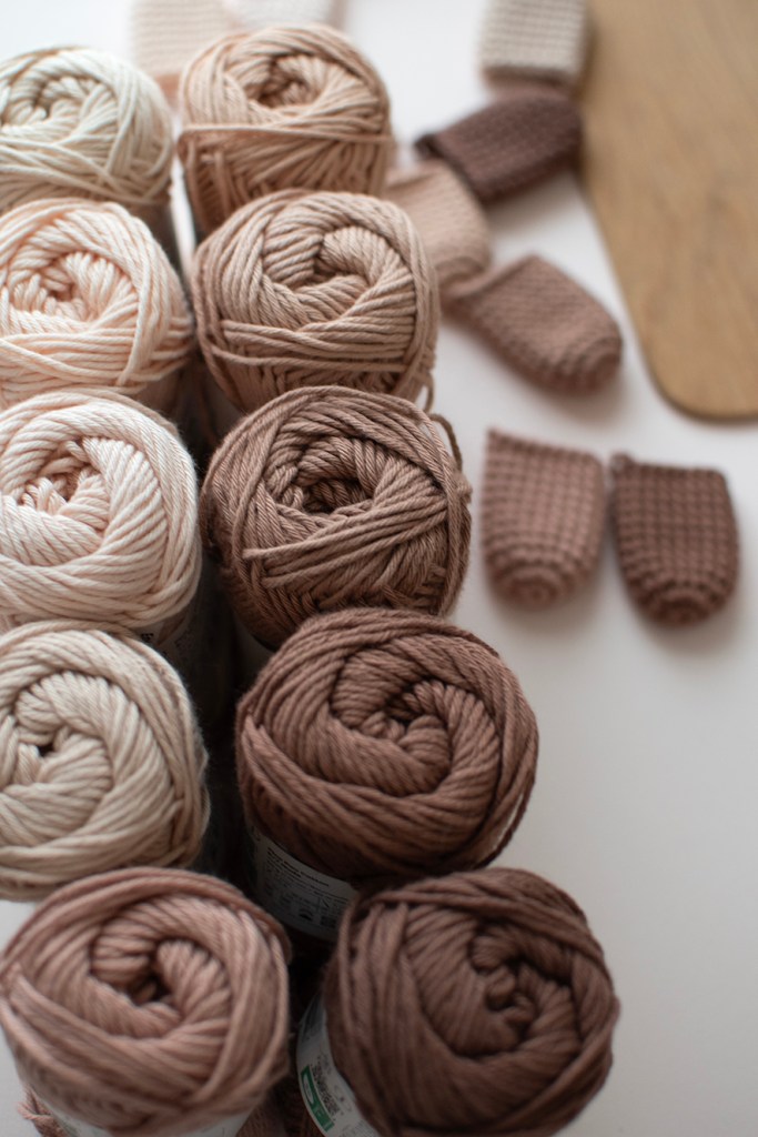 Pica Pau Cotton 8/7 is a 100% combed cotton yarn created in collaboration with Hobbii Yarns. Cotton 8/7 holds its shape beautifully without being stiff, making it ideal for amigurumi and other sculptural work that calls for clean stitches and expressive detail. If you are planning on using the yarn for amigurumi, I recommend using a 2.75 or a 3 mm crochet hook. For other projects, you can follow the sizes on the label of a 5 mm crochet hook or 4 mm knitting needles.